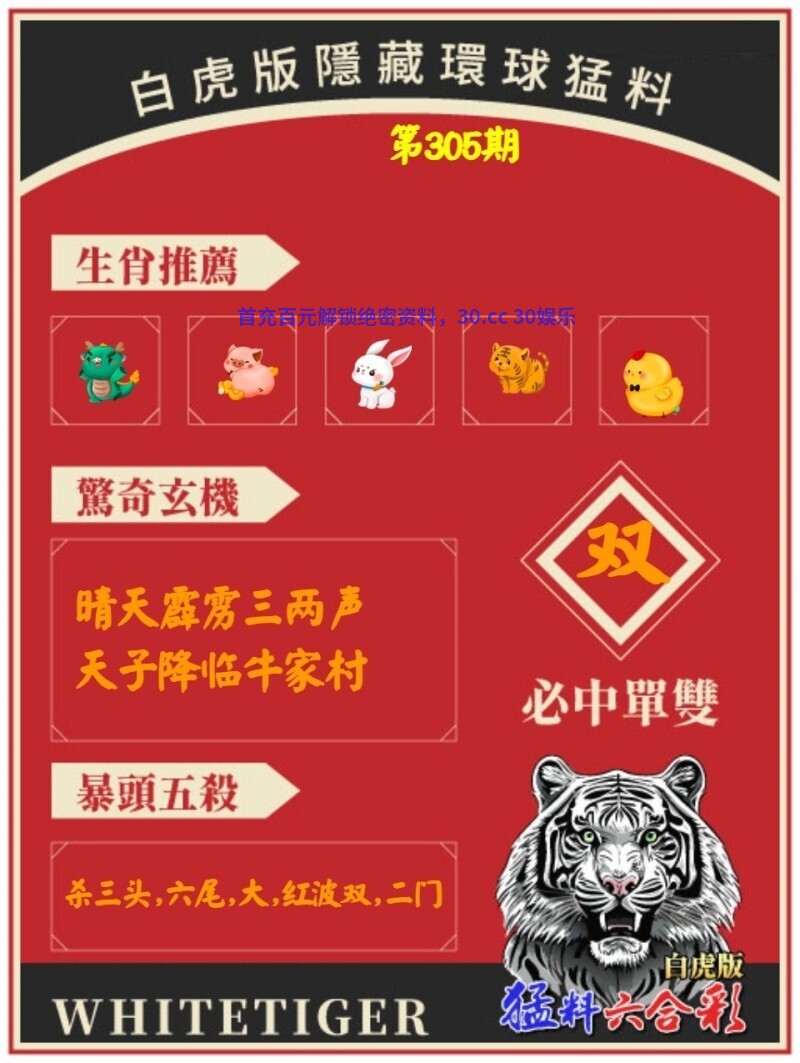305期:白虎环球猛料 开:鼠42对 晴天露雳三两声,天子降临牛家村 解释:晴天露雳三两声,天子降临牛家村,解猪鸡羊鼠 九肖:猪鸡羊鼠狗龙虎马猴  |